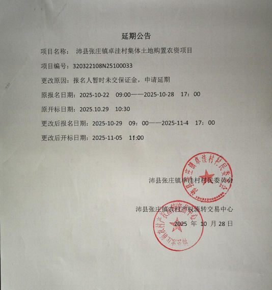 沛县张庄镇卓洼村集体土地购置农资项目延期公告