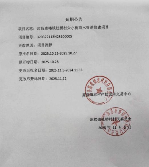 沛县鹿楼镇杜娇村朱小桥雨水管道修建项目延期公告