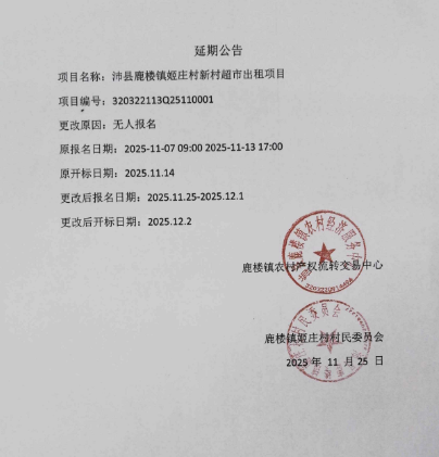 沛县鹿楼镇姬庄村新村超市出租项目延期公告