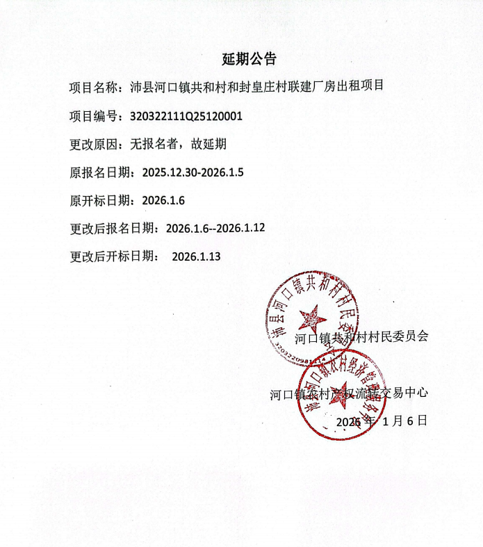 沛县河口镇共和村和封皇庄村联建厂房出租项目延期公告
