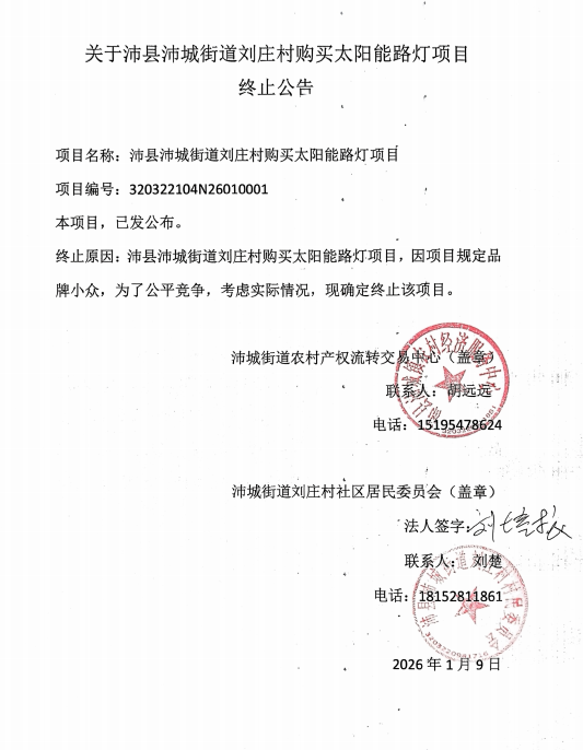 关于沛县沛城街道刘庄村购买太阳能路灯项目终止公告