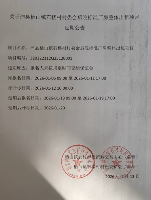 关于沛县栖山镇石楼村村委会后院标准厂房整体出租项目延期公告