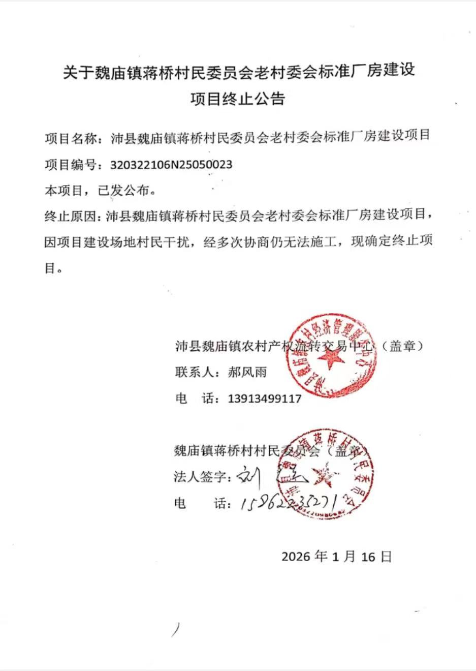 关于魏庙镇蒋桥村民委员会老村委会标准厂房建设项目终止公告