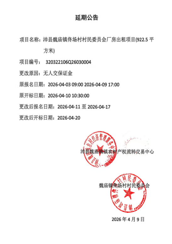 沛县魏庙镇佟场村村民委员会厂房出租项目(922.5平方米)延期公告
